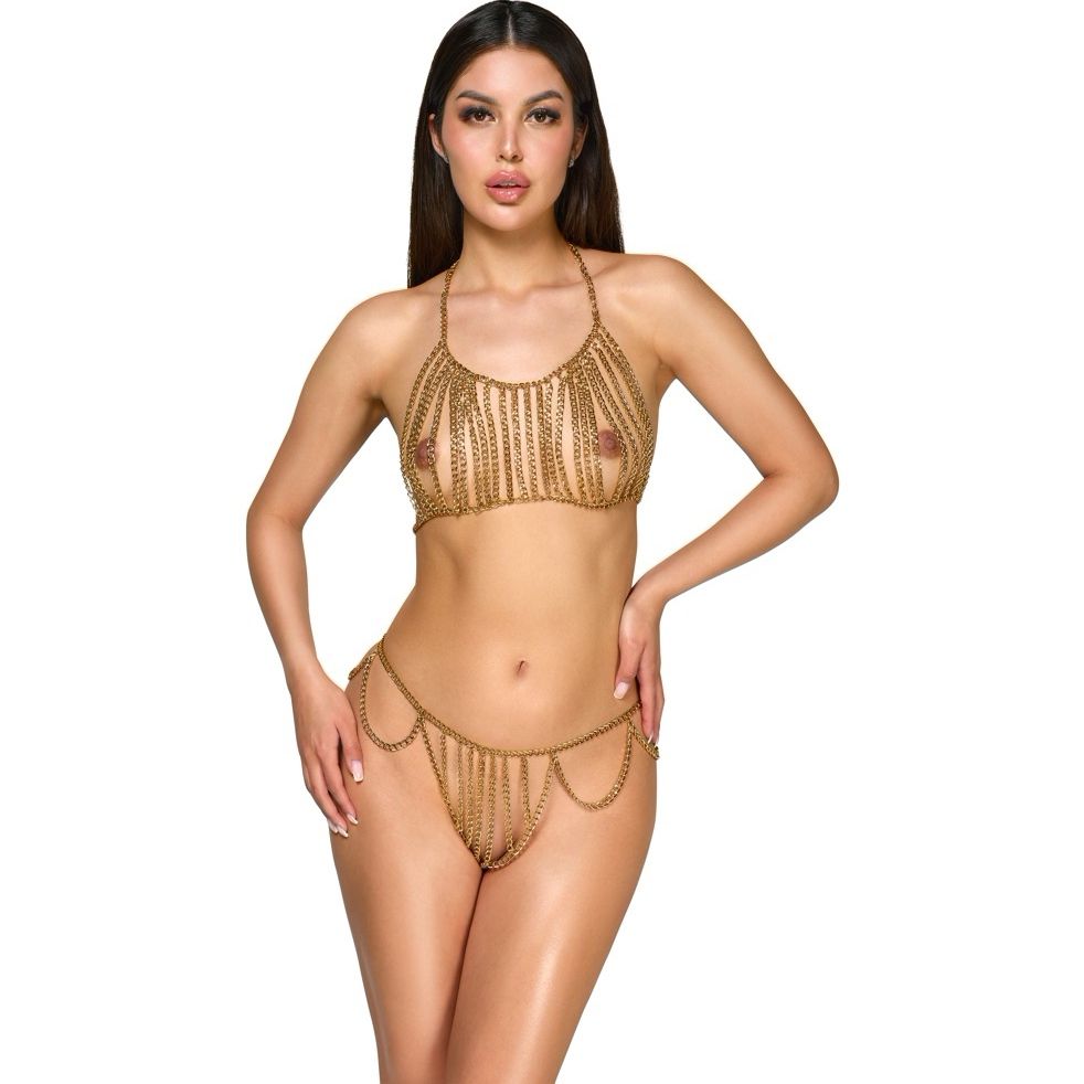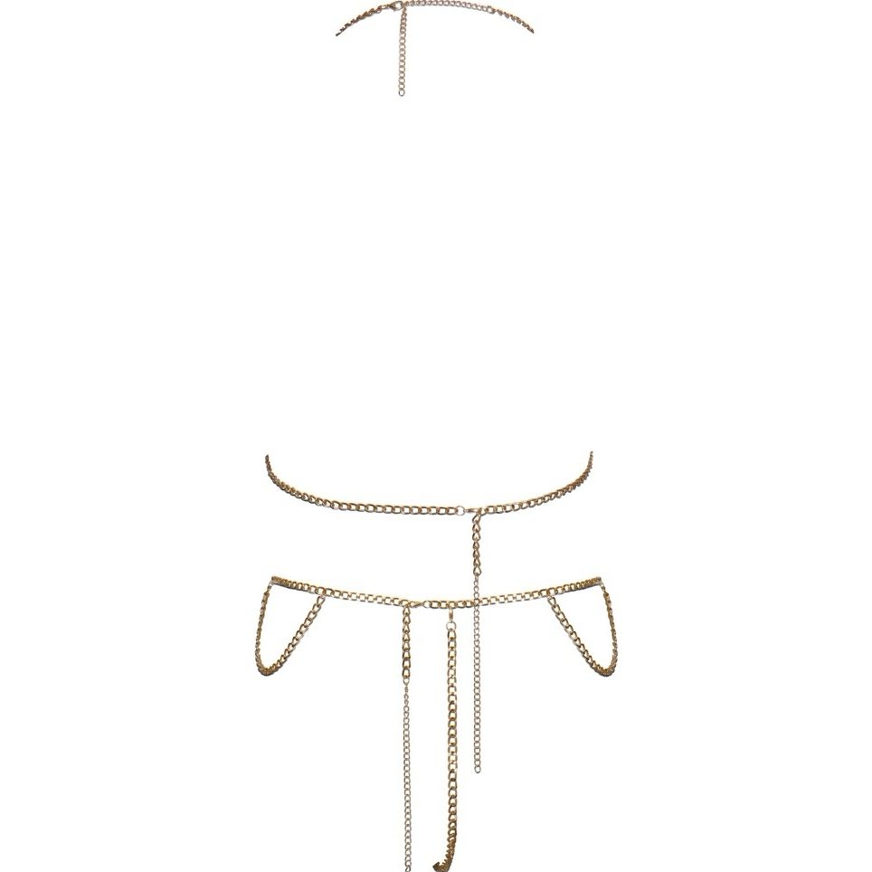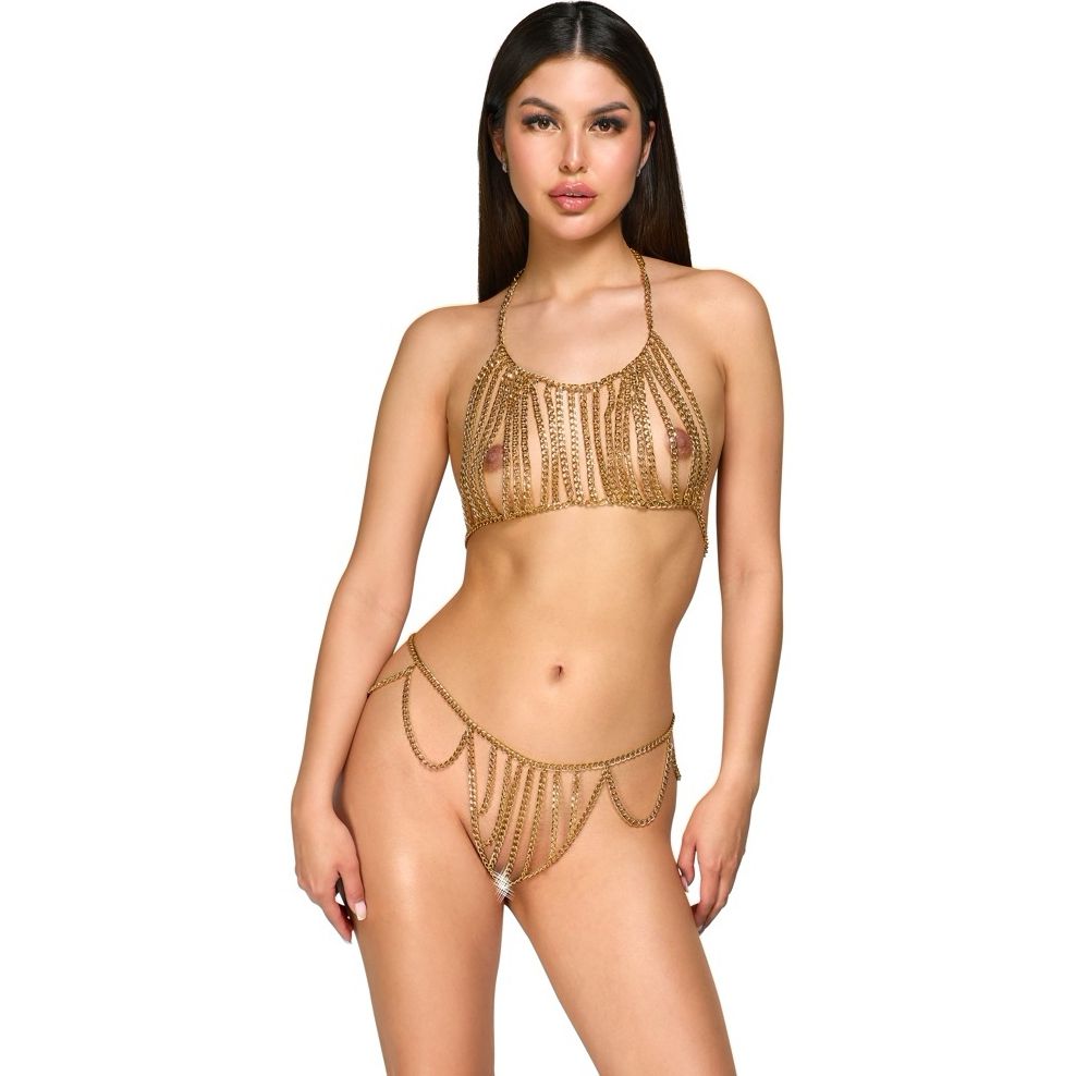Set din lanț metalic auriu: top halter și string cu decorațiuni pe bust, talie și șolduri. Lanțurile se reglează cu carabiniere; se poartă singur ca accesoriu incitant sau combinat cu costume de baie și ținute mulate.