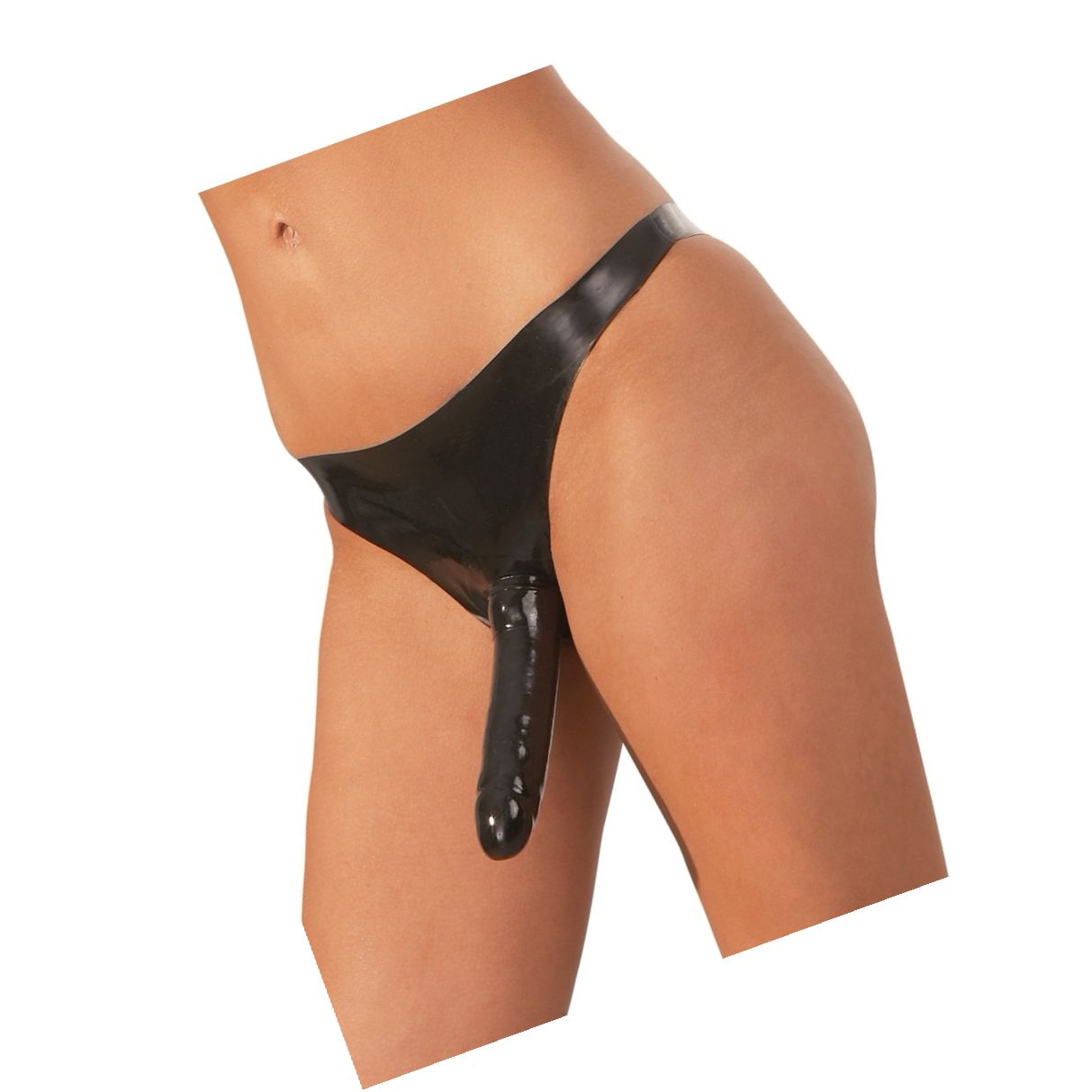 Slip din latex negru, model S–L, cu penis virtual concret fixat la exterior și un al doilea în partea interioară pentru stârnire vaginală sau anală. Dildo exterior: 16 cm, Ø 4 cm; interior: 12 cm, Ø 3.5 cm. Cauciuc normal (posibile alergii).
