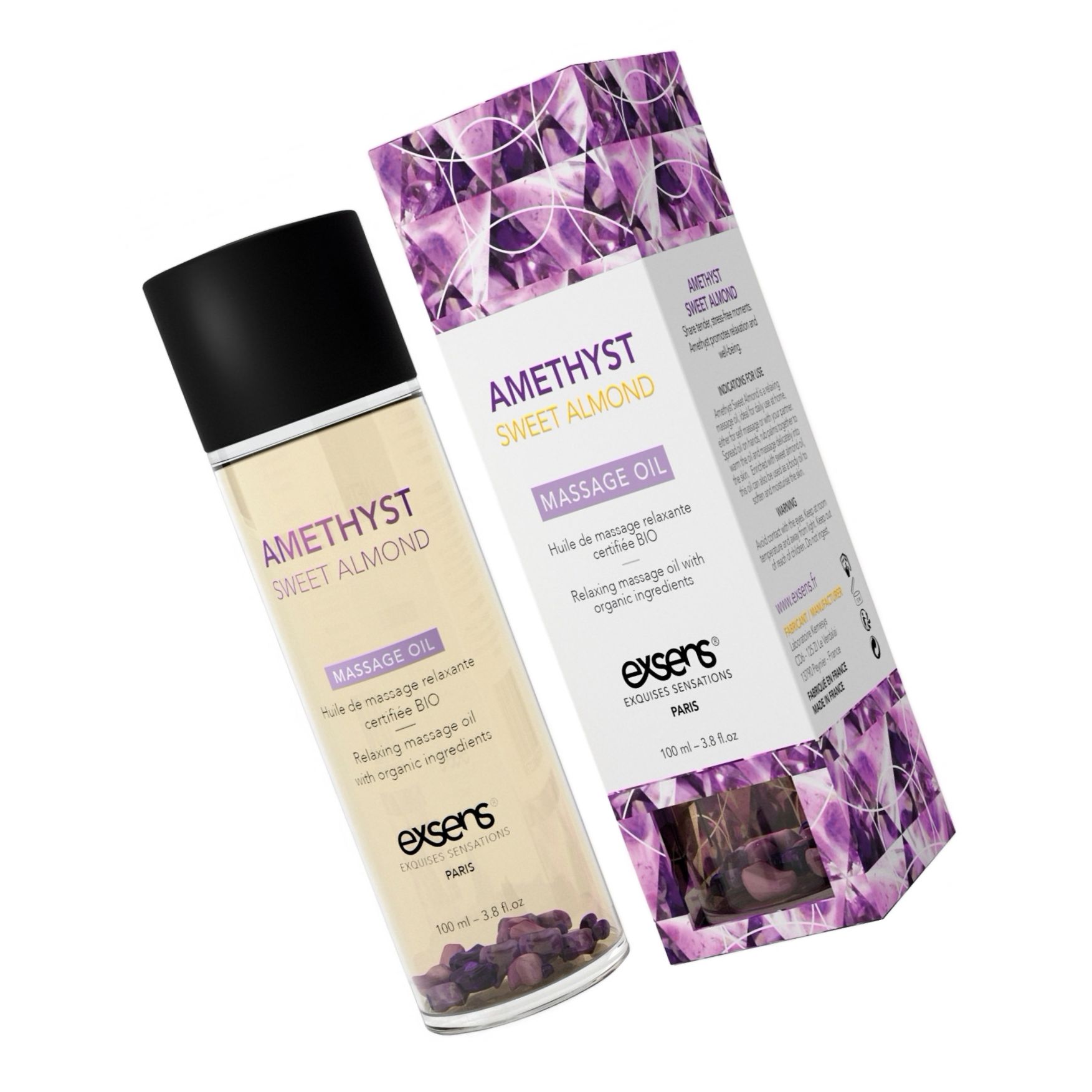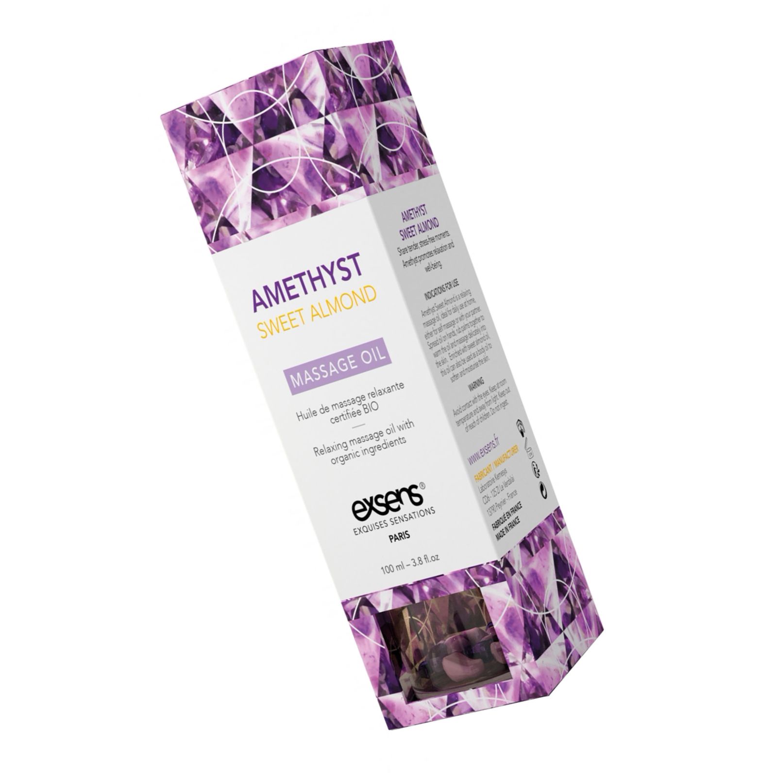 Ulei de masaj organic Exsens Amethyst, 92% ingrediente bio. Ulei de migdale dulci pentru hidratare şi catifelare, alunecare optimă, absorbţie rapidă şi parfum discret. Potrivit pentru toate tipurile de piele. 100 ml.