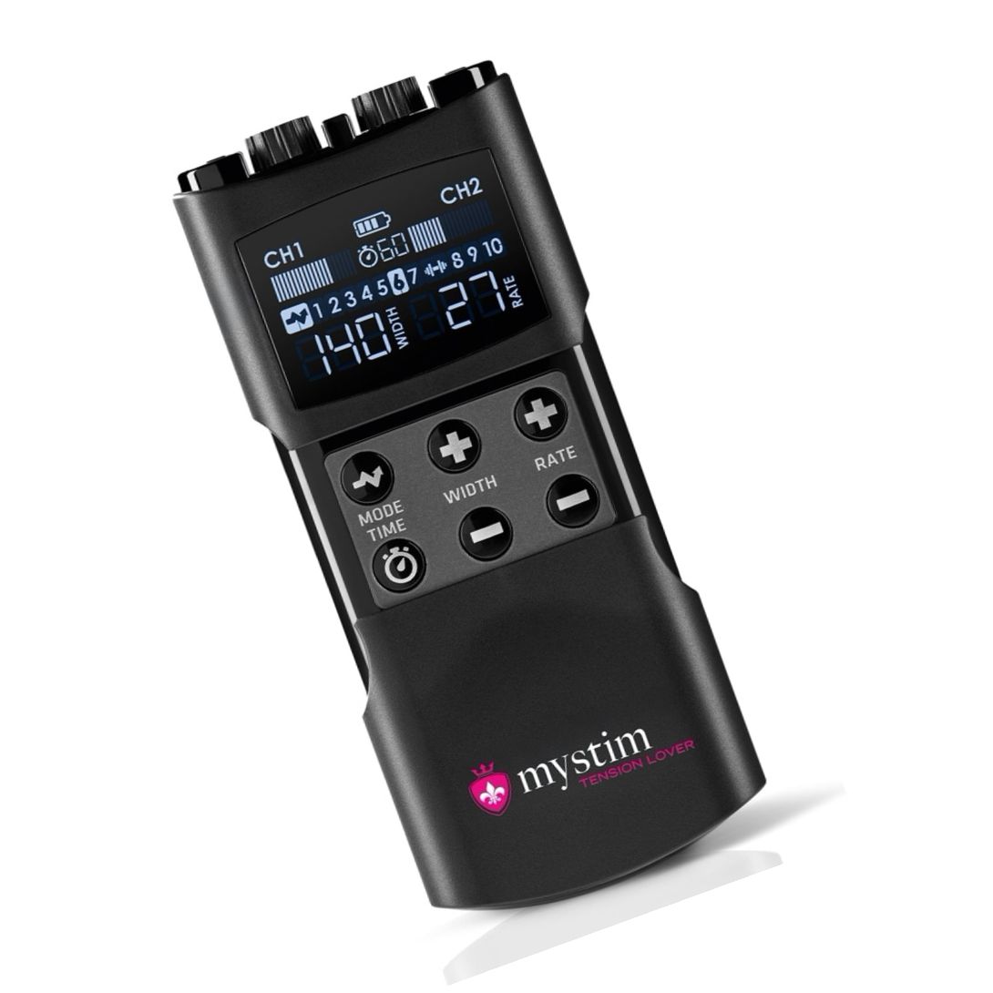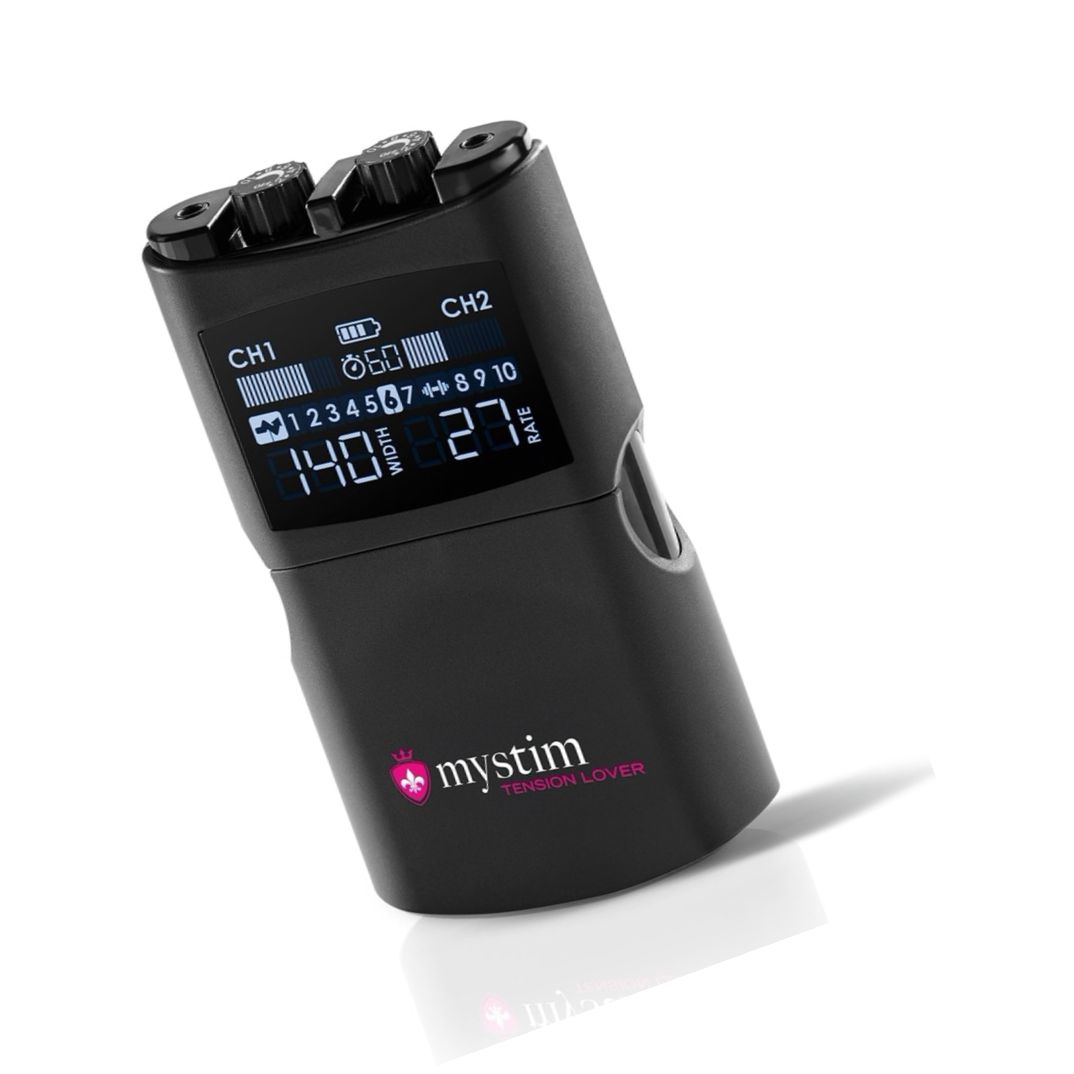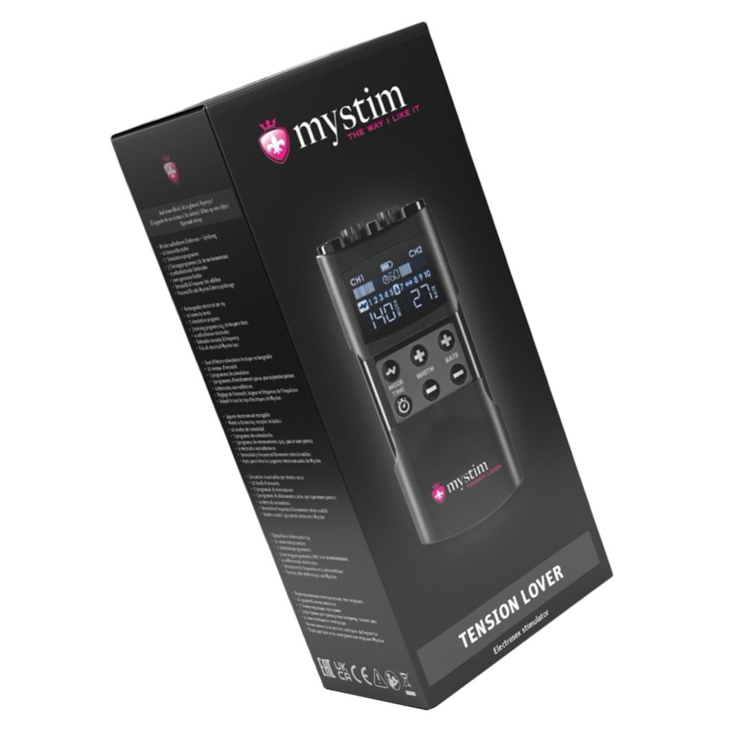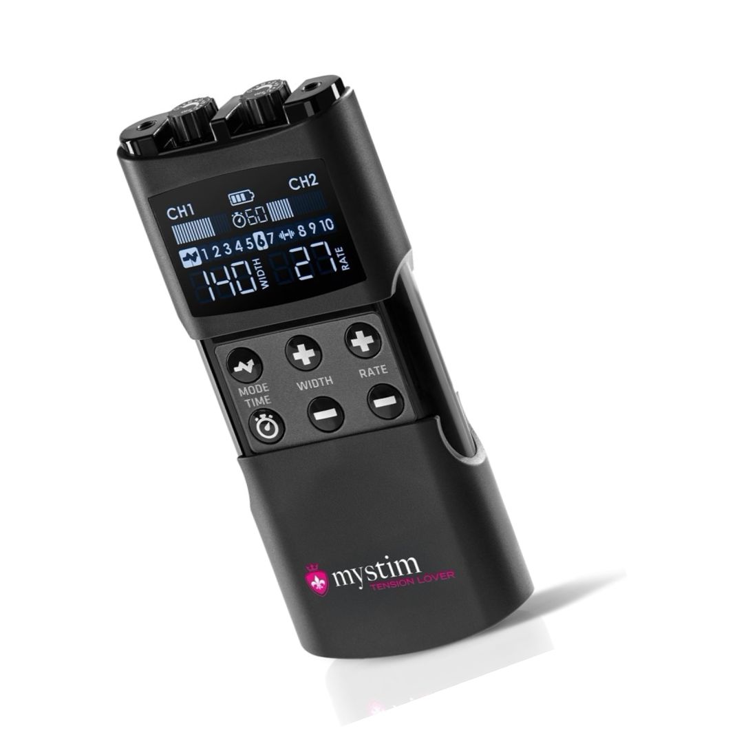 Mecanism EStim reîncărcabil, compact, Mystim Tension Lover 2: 2 canale independente, 7 programe de stimulare și 3 de antrenament, reglaje pentru intensitate, lățime impuls 50–260 µs și frecvență 1–160 Hz. Conține 4 electrozi reutilizabili, 2 cabluri și cablu USB-C.