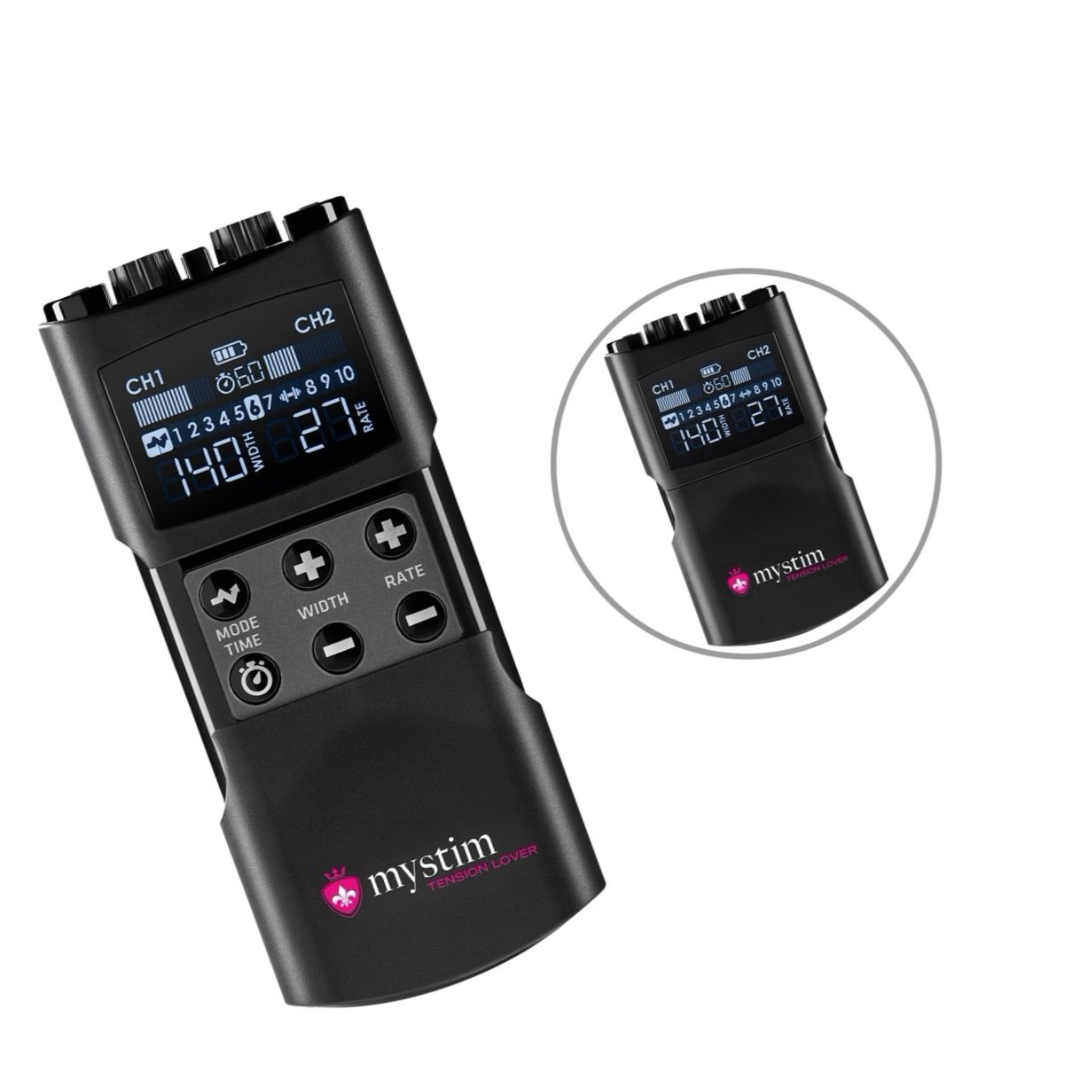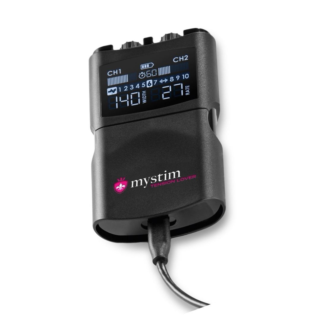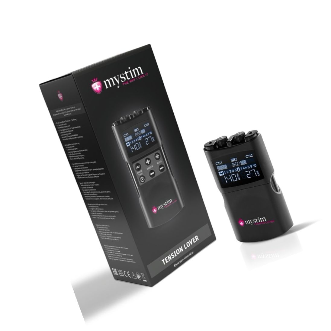 Mecanism EStim reîncărcabil, compact, Mystim Tension Lover 2: 2 canale independente, 7 programe de stimulare și 3 de antrenament, reglaje pentru intensitate, lățime impuls 50–260 µs și frecvență 1–160 Hz. Conține 4 electrozi reutilizabili, 2 cabluri și cablu USB-C.
