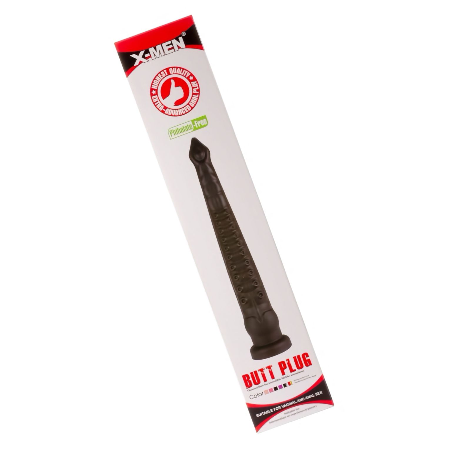 Plug anal X-Men din PVC, plămădit din material prietenos cu dermă și finisaje netede pentru inserare controlată. Forma cu sfere oferă stimulare treptată, iar ventuza de la bază asigură stabilizare stabilă pe suprafețe plane.