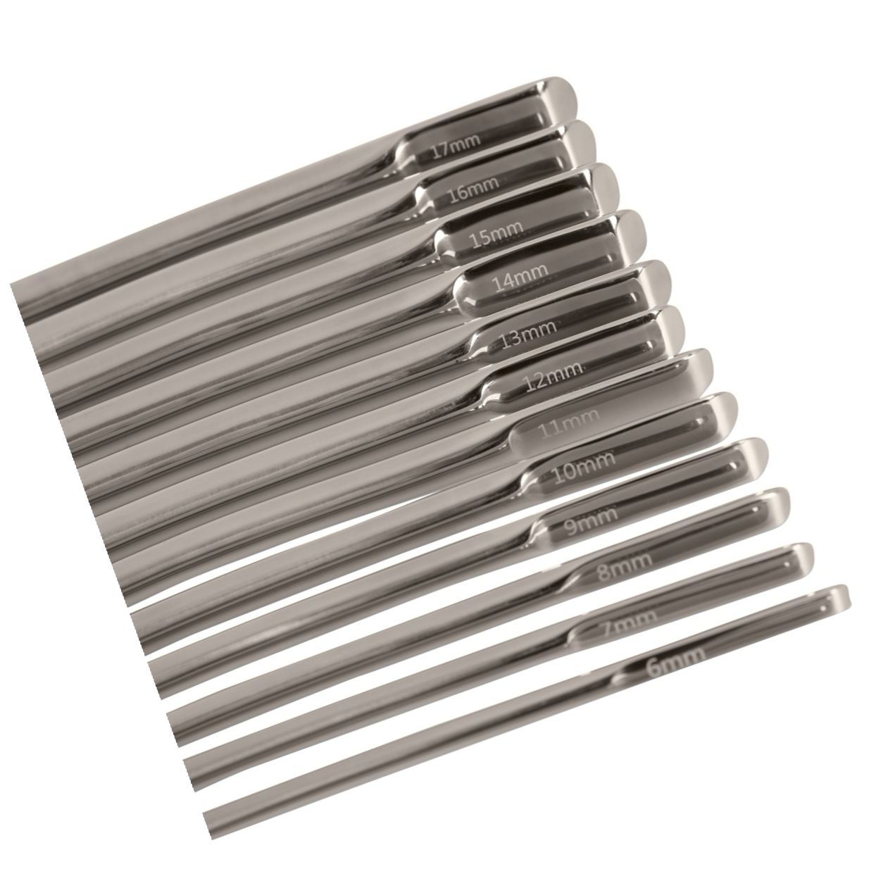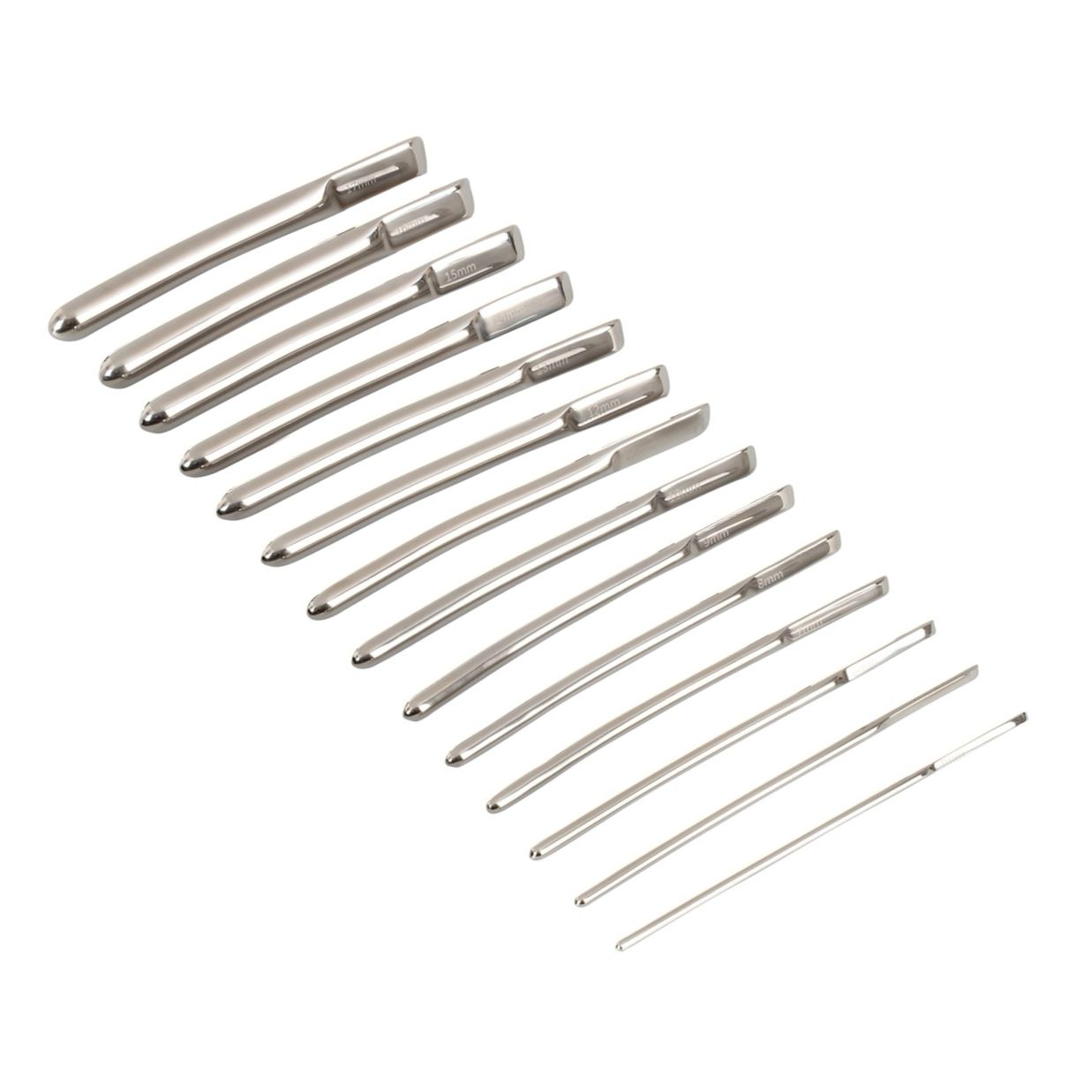 Set de 14 dilatatoare din oțel inoxidabil, finisate lucios, cu vârf rotunjit și ansamblu de prindere plat pentru prindere sigură. Gravură cu litera O pentru identificare și cutie de depozitare inclusă. Simplu de purificat și durabil.