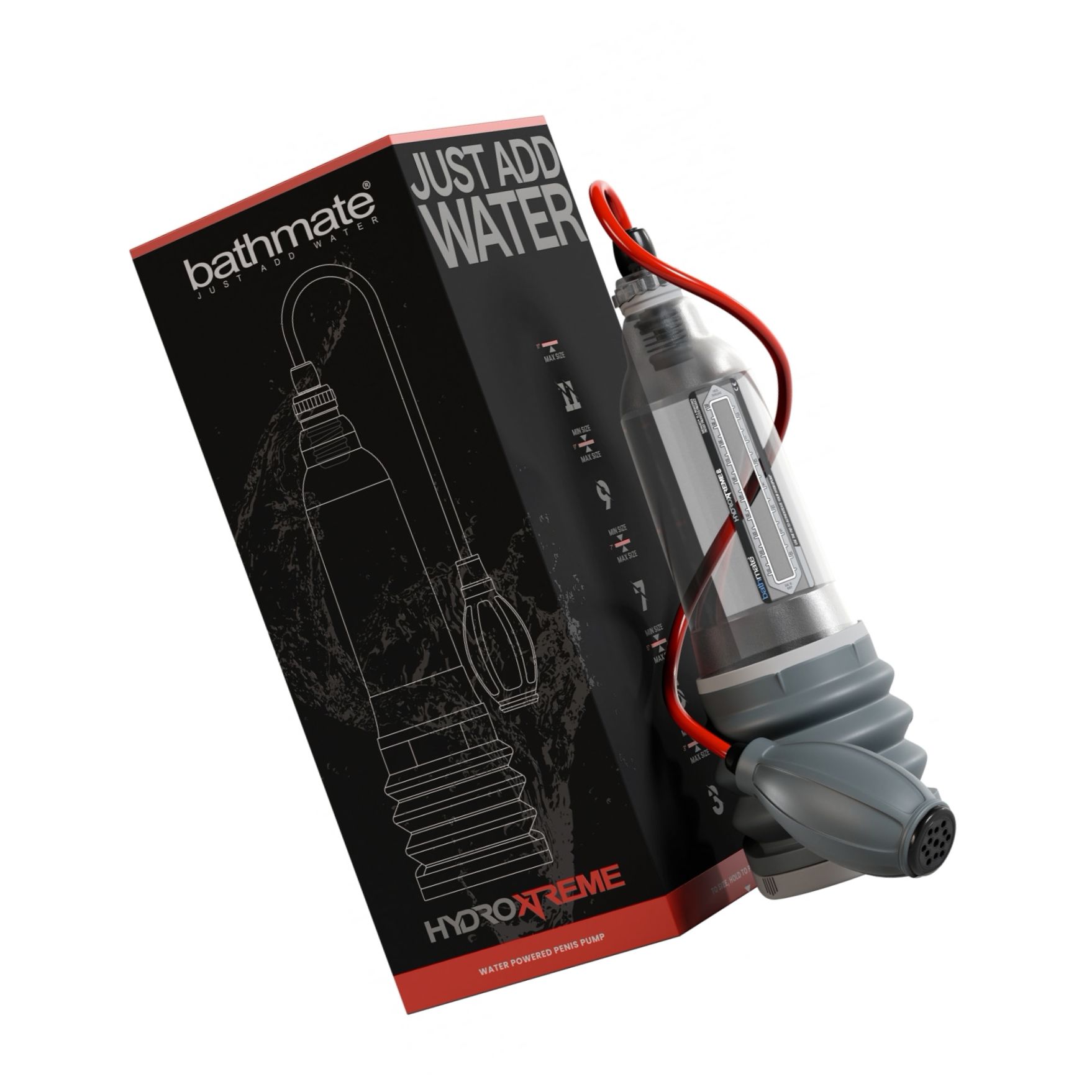 Pompa hidro HydroXtreme8 Bathmate: cilindru transparent cu scară, supapă îmbunătățită și minge detașabilă pentru control precis al presiunii. Confecționată din PC și TPE, colet complet cu accesorii utile. Adecvată pentru lungimi active ≈15–20 cm; întrebuințare discretă în duș sau cadă.