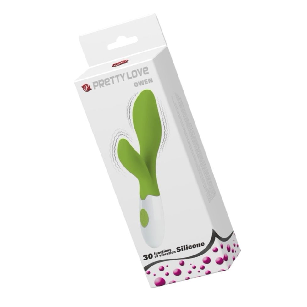 Vibrator Pretty Love Owen cu 30 moduri de vibrație pentru stimulare dublă: clitoral (stimulator tip deget flexibil) și vaginală. Făcut din silicon sigur, estetică ergonomic, simplu de purificat și durabil la apă. Funcționează cu 2 baterii AAA.