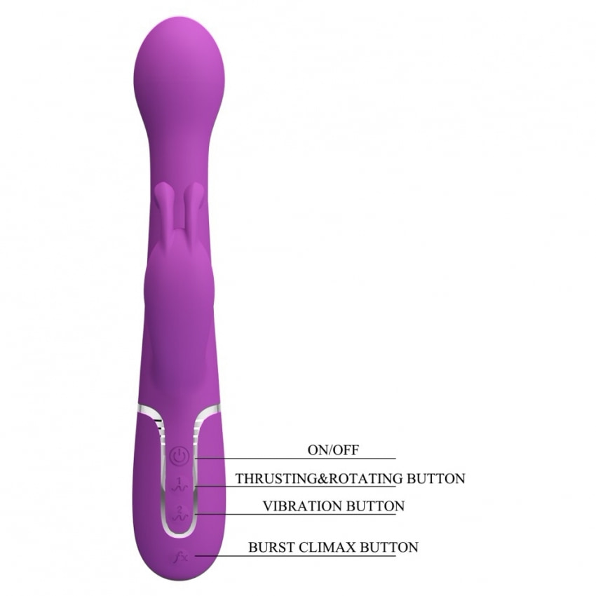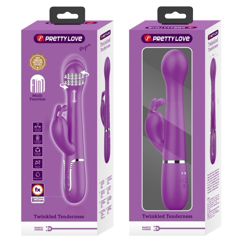 Pretty Love Dejon Rabbit: vibrator reîncărcabil cu două motoare pentru stârnire internă și externă. 7 trepte de vibrație, rând vertical de bile cu 3 viteze și funcție Burst. Finisaj mov, întreținere simplă.