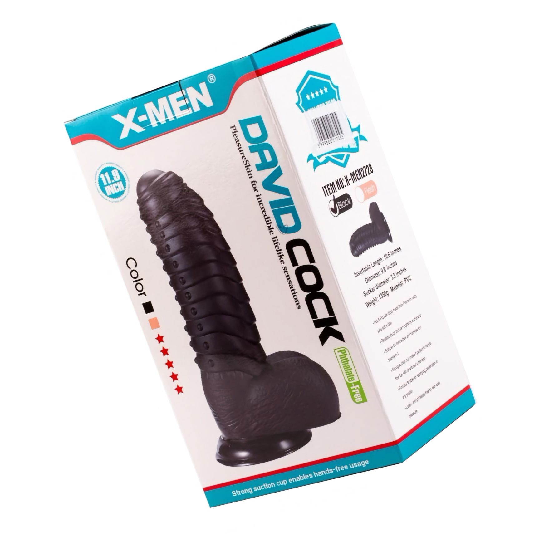 Jucărie sexuală compactă X Men Davids, mărime radicală 27 cm, diametru 7 cm. Material PVC cu senzaţie de piele, suprafaţă stimulante şi detaliu anatomic realist. Sucțiune intensă pentru utilizare fără mâini. Fără motor; se curăţă uşor. Propus material lubrifiere pe bază de apă.