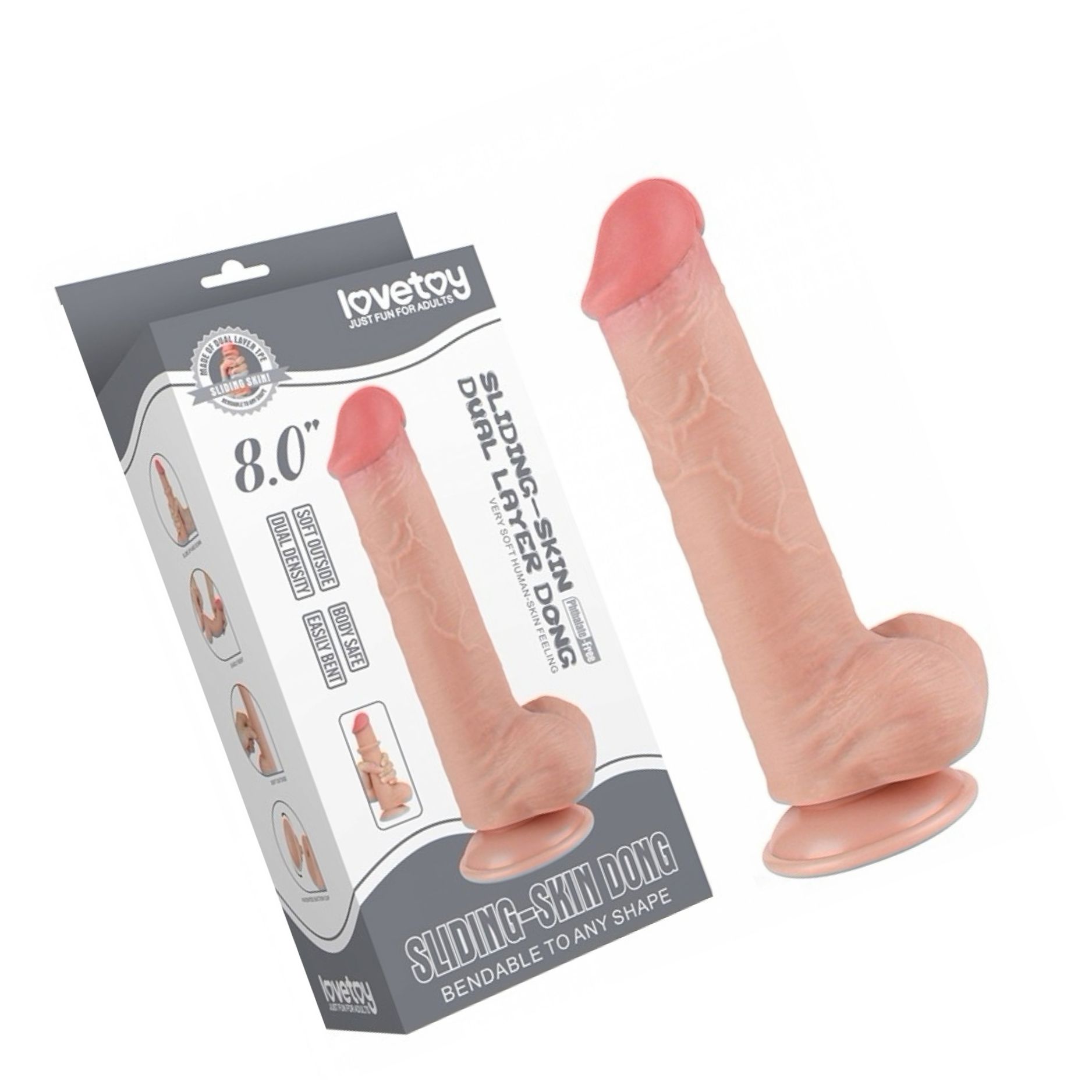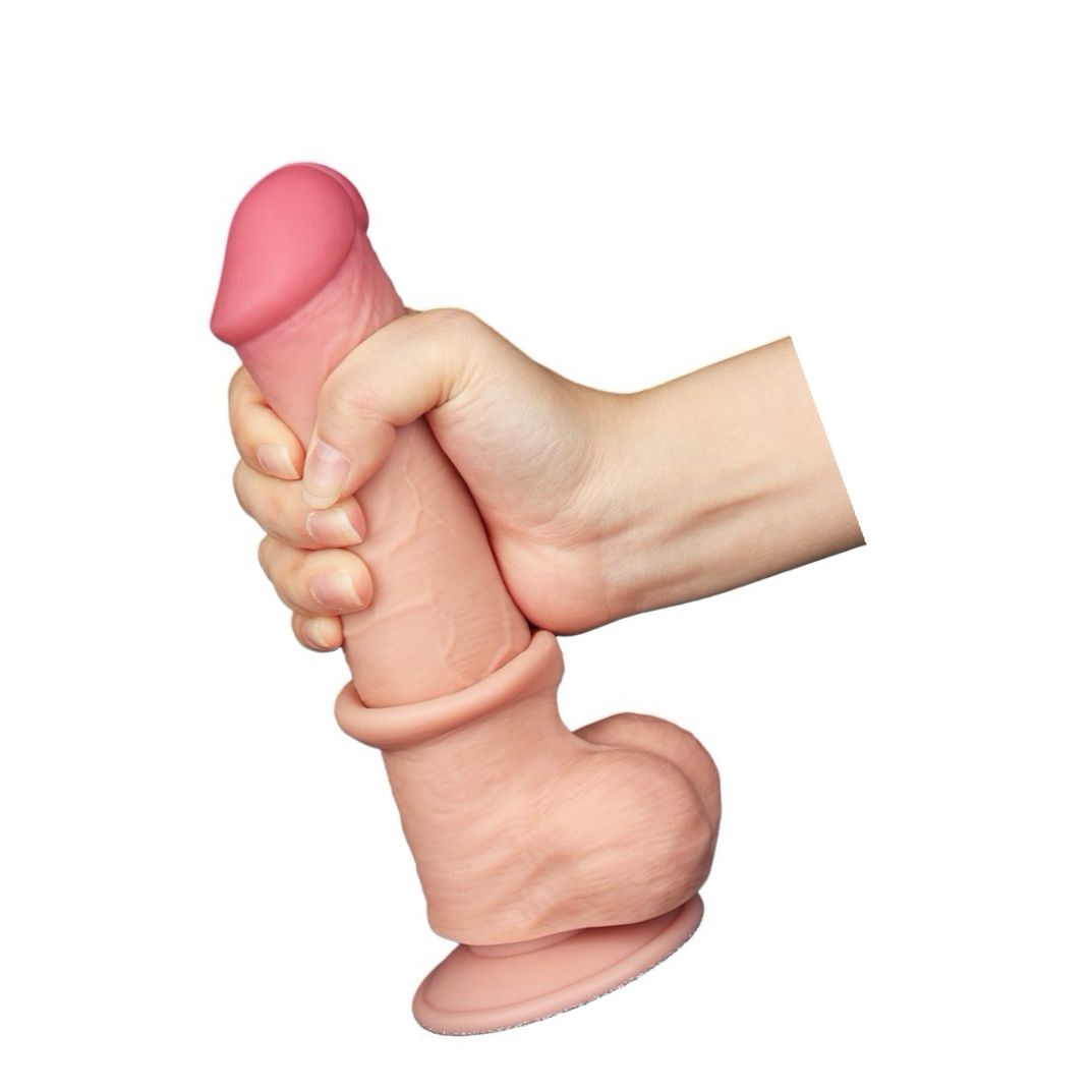 Jucărie intimă LoveToy Sliding-Skin, TPE dual-layer: exterior moale, miez ferm. Lungime integrală 20.8 cm, calibru Ø4 cm. Ventuză detașabilă pentru întrebuințare hands-free. Aferent cu lubrifianți pe bază de apă; curățare simplă.