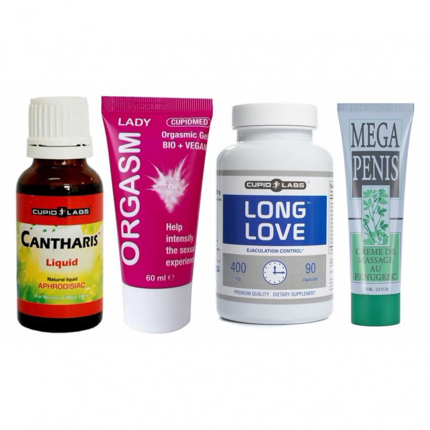Ce asigură fiecare produs: - Capsulele Long Love: formulă pe bază de plante care participă la întârzierea ejaculării, sporind controlul și reducând tensiunea legată de performanță. Ambalaj generos pentru o utilizare continuă și discreție în rutină. - Gel Plăcere sexuală maximă Lady: flacon compact cu textură plăcută, hipoalergenic și fără parfum; mărește receptivitatea zonelor erogene, oferind căldură și furnicături care amplifică excitarea și intensifică momentele intime. - Picăturile Cantharis: concentrat natural, adresat ambelor sexe, care declanșează o creștere a dorinței și energiei; efect fără întârziere dacă se administrează cândva de apropiere. Variantă practică pentru serile în care doriți să treziți apetitul sexual. - Cremă Mega Penis: soluție cu extracte ca de pildă schinduf și melilot care stimulează circulaţia locală, dând senzație de plenitudine și sprijin pentru erecții mai ferme; eficiența augmentează prin aplicare continuă și poate fi completată cu dispozitive pentru rezultate vizibile.