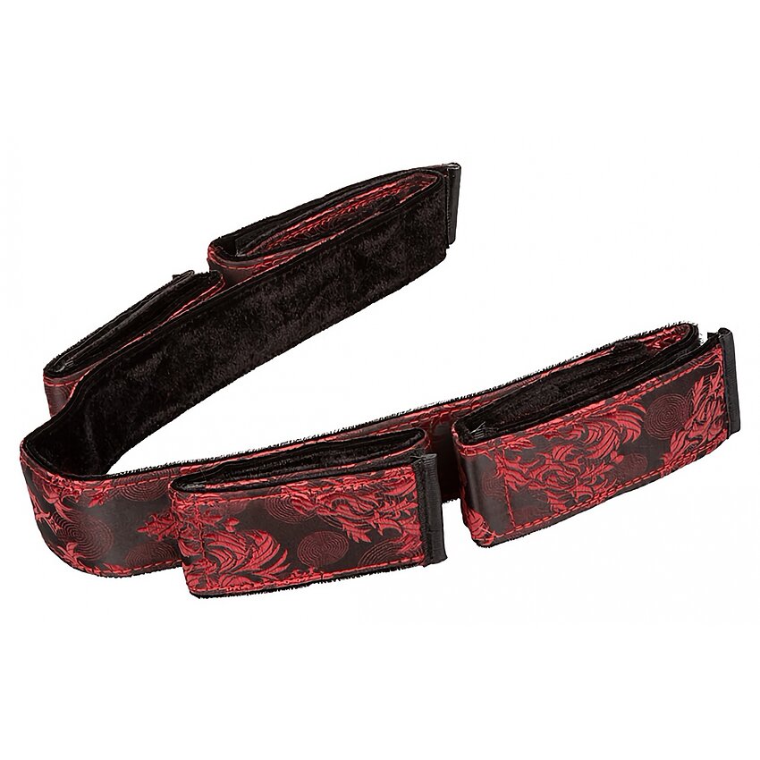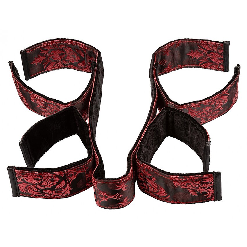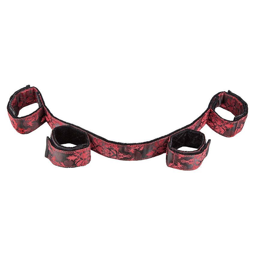 Curea despărțitoare ajustabilă la încheieturi și la glezne. Conține o parte plușată pentru confort și o parte cu model pe material. Se prinde cu arici. Patru manșete de lux sunt conectate la o bară de design flexibilă pentru a lega strâns încheieturile și gleznele în poziții delicate expuse. Predați-vă oricărui capriciu al iubitului vostru.