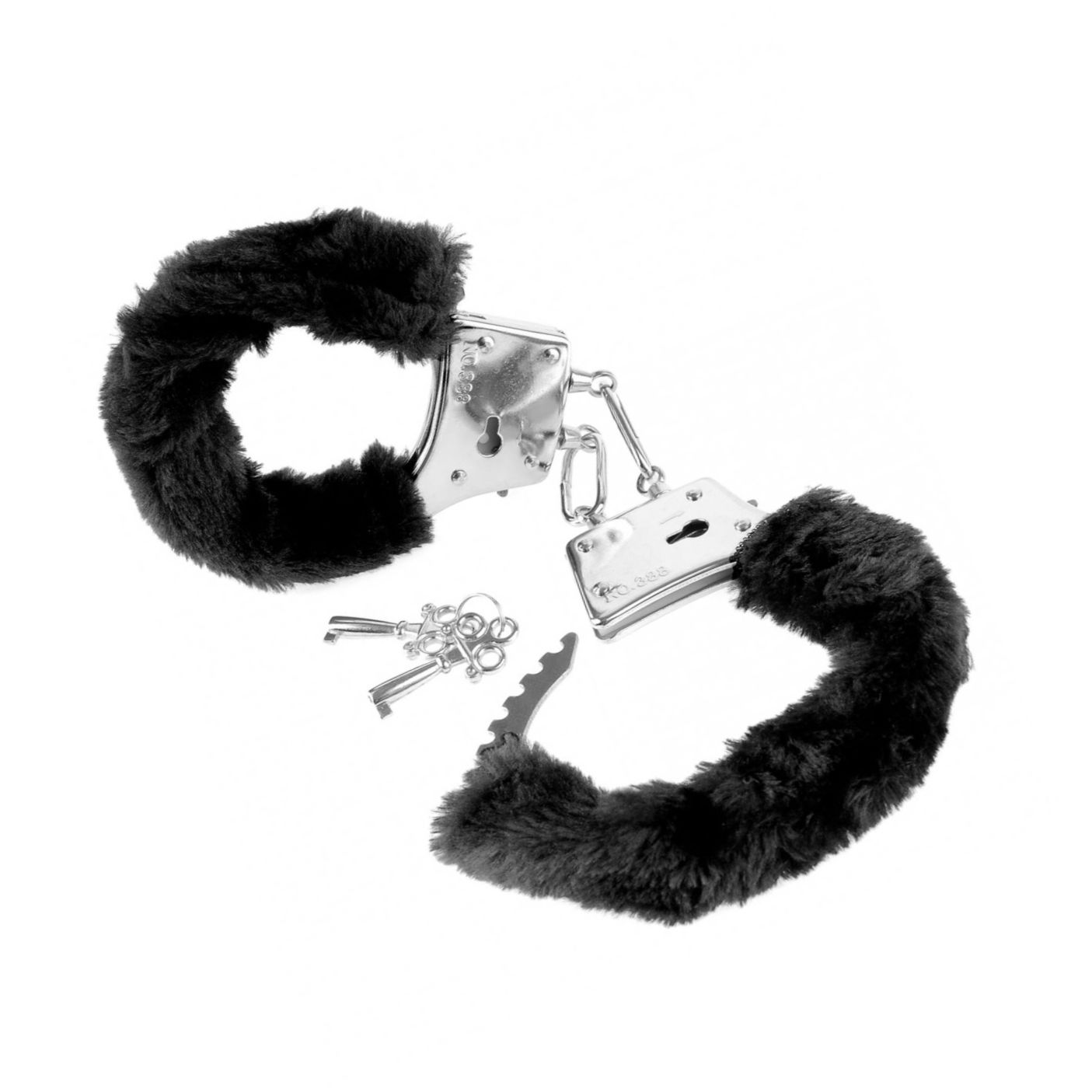 Cătușe metalice pentru mâini îmbrăcate în blăniță artificială neagră. Pachetul este prevăzut cu 2 chei. Condimentează-ți viața senzuală de cuplu!