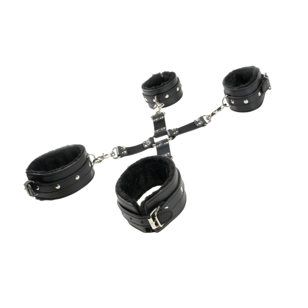 Experimentează senzații erotice intense! Kit pentru limitarea mișcării gâtului și mâinilor. Cătușe căptușite și reglabile, cu sistem de fixare Velcro. Confecționat din fibre sintetice rezistente la rupere. Pentru aventuri îndrăznețe și umplute de pasiune!