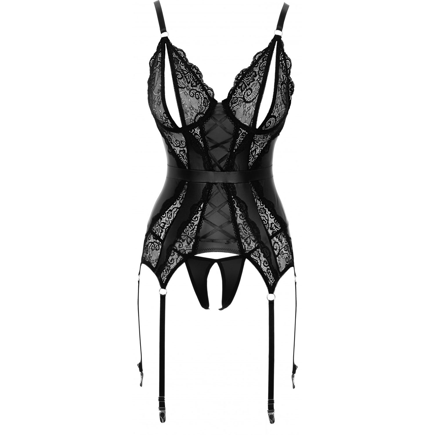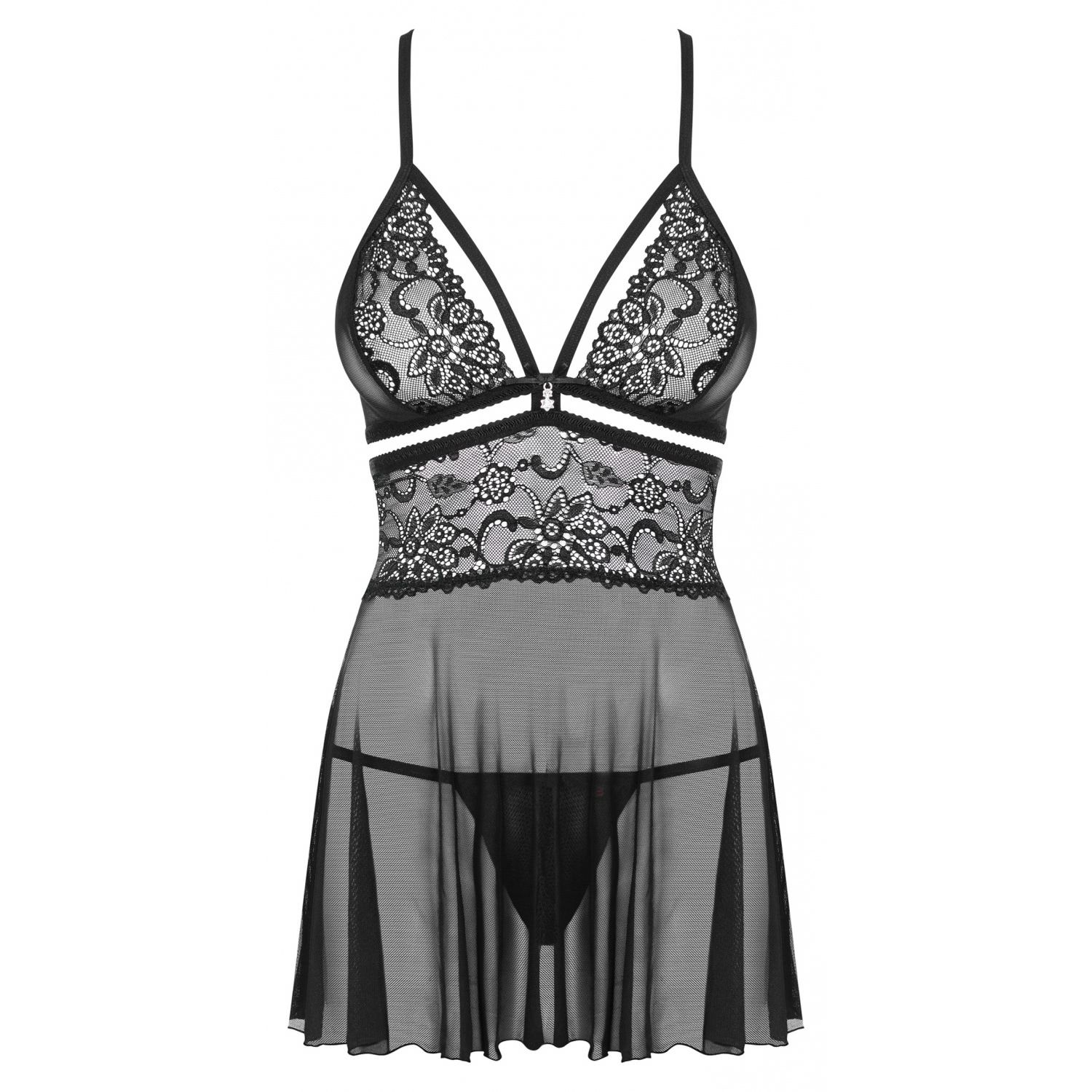 Babydoll negru cu bretele ajustabile și închidere cu cârlig în spate. Cupe deschise, rupte, pentru a se închide cu un arc și cusătura din dantelă.
