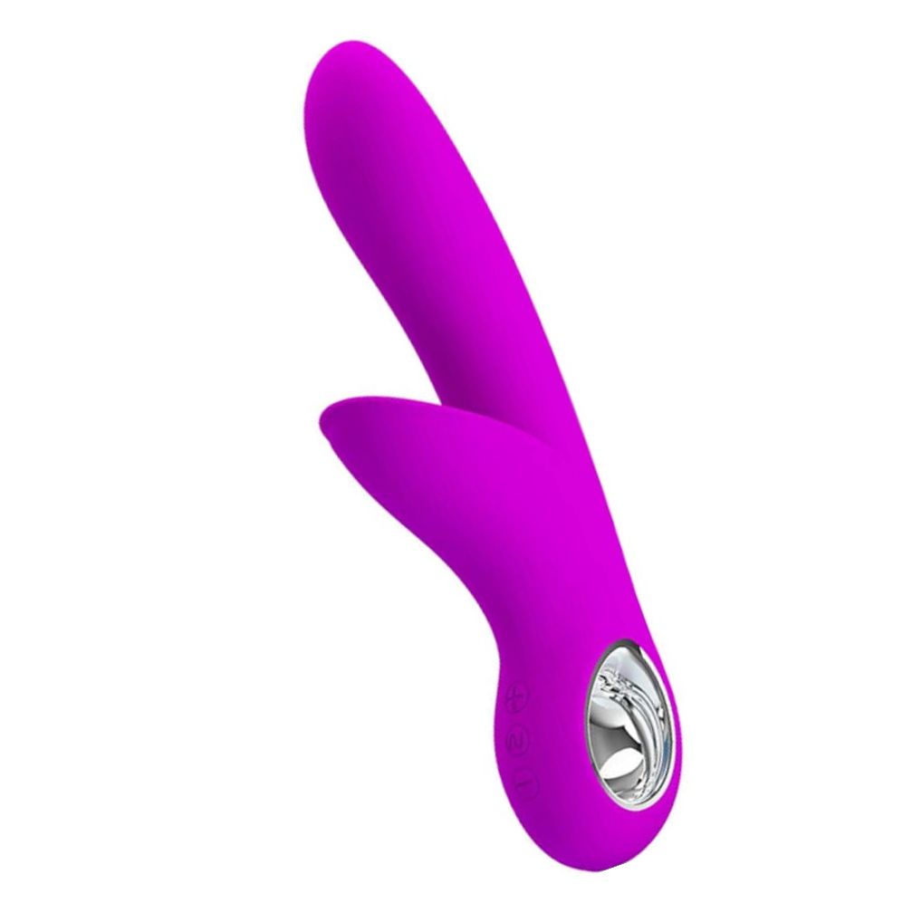 Stimulator dual Pretty Love Rasmussen: cap ergonomic pentru punctul G și braț elastic pentru contact constant cu clitorisul. 30 moduri de vibrație puternică, material sigur din silicon și ABS. Lungime 19.8 cm, inserabil 10.4 cm, calibru 3.6 cm.
